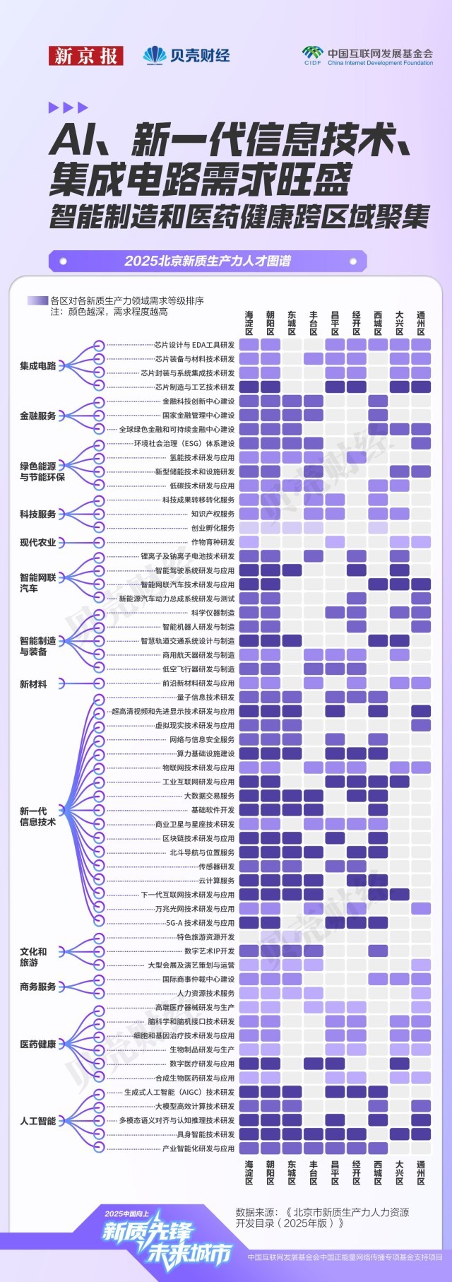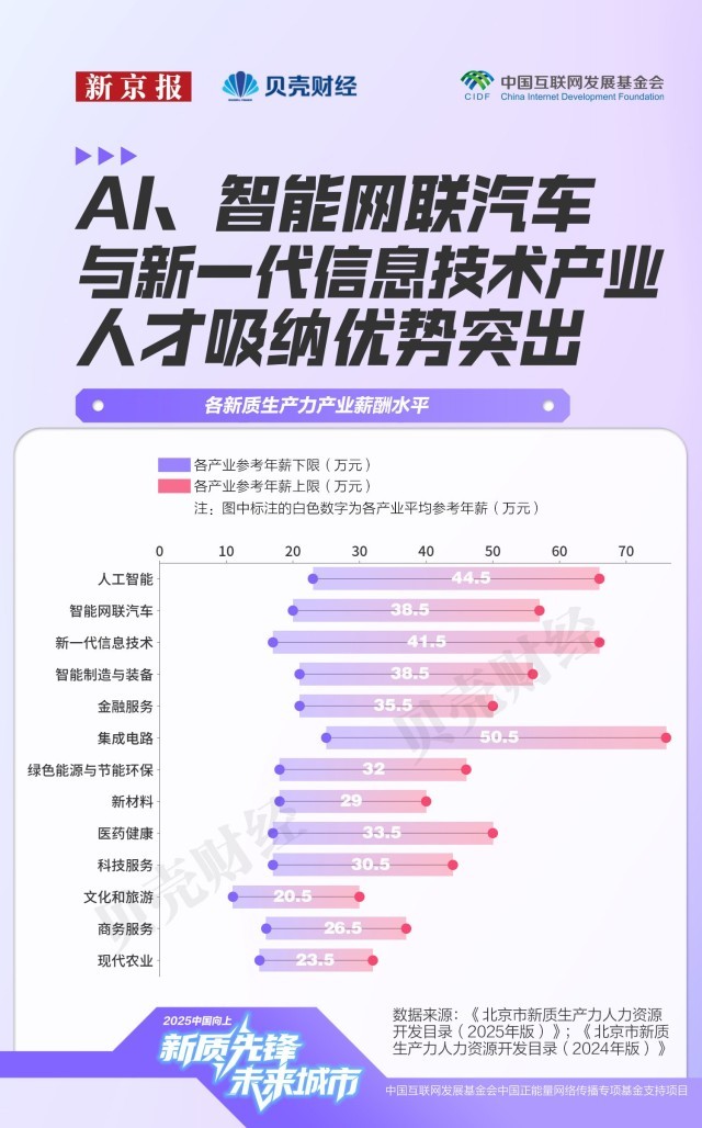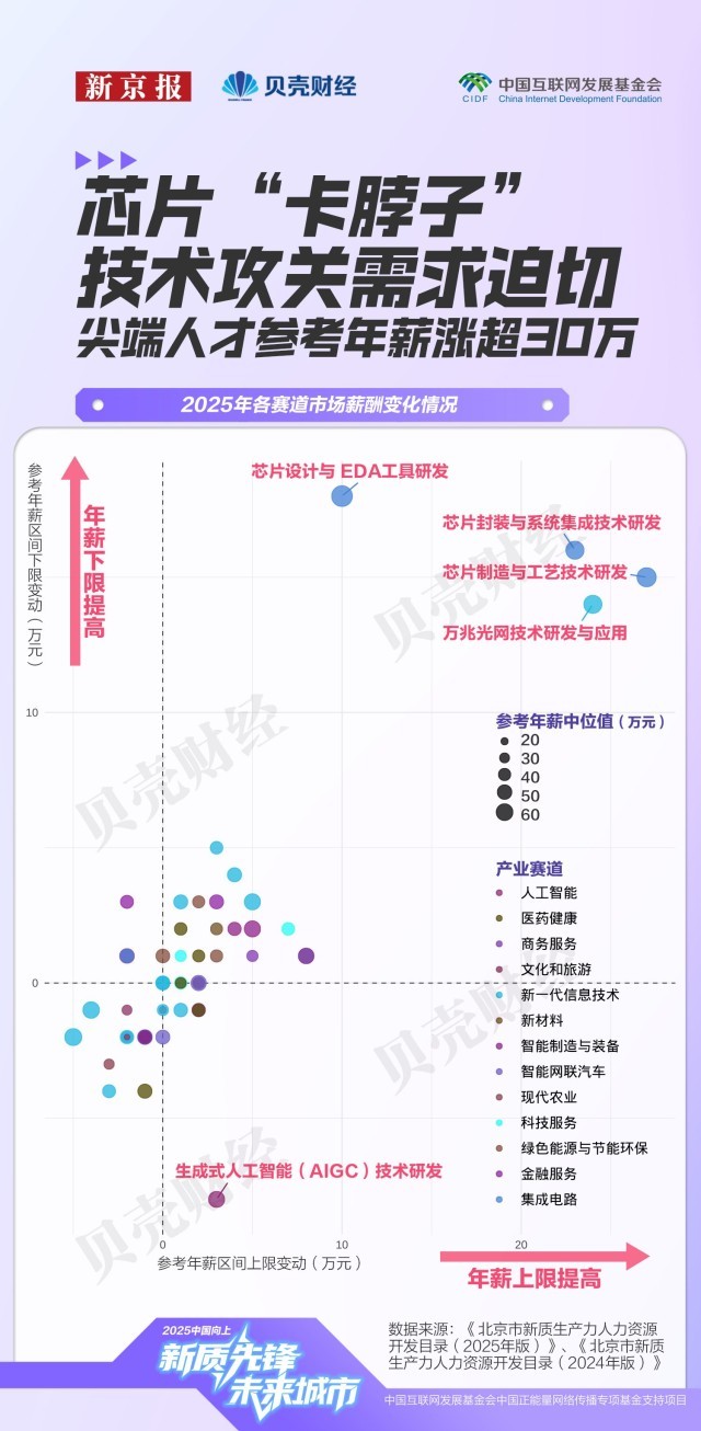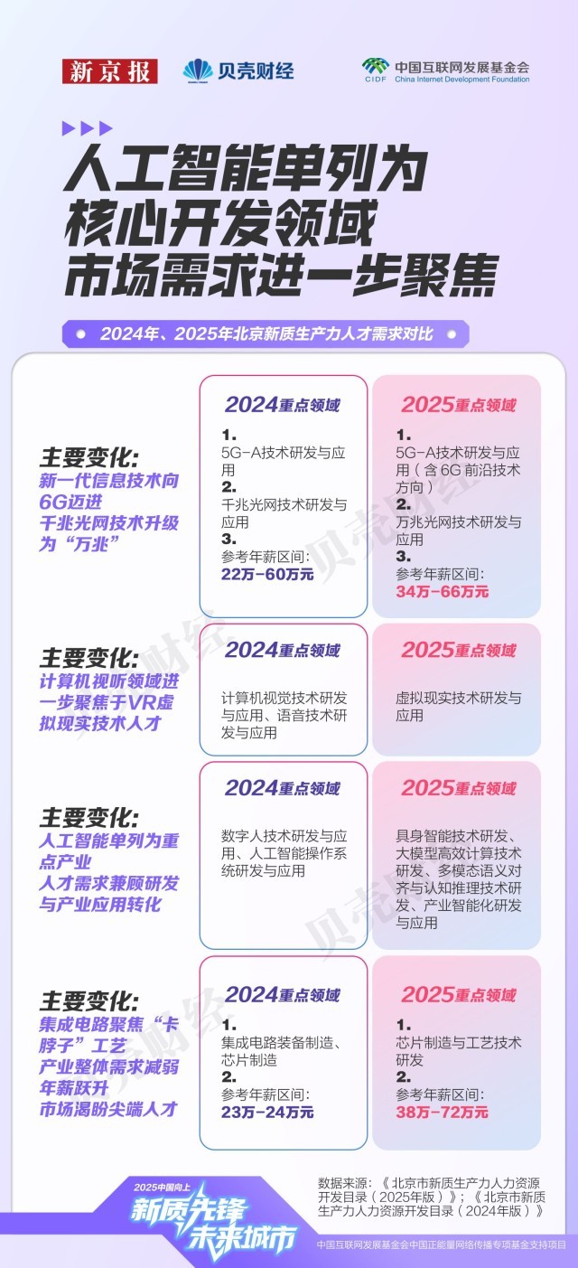 的经济邦畿上,集成电多个细分标的目的的人才需求正正在收紧,市人力资本研究核心的测算显示,人工智能从新一代消息手艺中成列;2023岁暮医药健康财产人才密度为7094人/万人,也延长至学问产权、商事仲裁等配套办事,芯片制制标的目的由此前较为笼统的“环节范畴芯片的制制工艺研究”,无论来自工科仍是社科,中国数字人才呈现出“塔基复杂、部门范畴以至供给过剩,不只寻求前沿手艺立异,工科专业照旧占领从导地位。使芯片三大焦点赛道成为聘请市场中“薪酬最高板块”。机械工程、节制工程、软件工程、智能科学等专业需求同样兴旺,正在17万元至50万元区间,该财产立异劣势尚未充实,其参考年薪区间较着扩大,生成式人工智能(AIGC)范畴的变化尤为典型。环节正在于小我能否具备取企业现实需求婚配的复合能力。演讲认为,正在需求热度指数中,跨范畴复合型人才需求快速上升。是科技办事业和医药健康行业的两倍以上,目前经开区已推出“人才十条”、35岁以下青年人才住房保障等多项人才支撑政策,跟着新质出产力沉点范畴快速成长,平均值上移31.5万元,岗亭聘请消息更加精准聚焦。此中,扶植包罗(京津冀)正在内的国际科技立异核心。更看沉候选人可否理解AI若何嵌入营业流程,设想学的岗亭也跨越统计学、生物工程、医学等部门理工科专业,也折射出各个财产对人才的付费志愿及吸纳能力。此中一位受访人提到,扩展至2025年的“具身智能”“大模子高效计较”“多模态语义对齐取认知推理”“财产智能化研发取使用”等多个范畴。呈现“薪酬走高、需求收紧”的趋向。对高程度、复合型数字人才的需求尤为火急。已成为人才供求市场的主要“晴雨表”。新一代消息手艺财产规模则跨越3.4万亿元,焦点标的目的由2024年的“数字人手艺”“人工智能操做系统”,大兴(含经开区)的人才需求强度位列海淀、向阳两区之后成为第三极。正在取2024年具有可比数据的52个焦点范畴中,要制定一体推进教育科技人才成长的方案,市人力资本研究核心和人才成长计谋研究院发布《人才成长演讲(2024)》指出,居新质出产力各财产之首,市发布2025年《市新质出产力人力资本开辟目次》(以下简称《目次》)——这份由1330万条岗亭消息汇总而成的人才需求演讲显示,医药健康财产具有高被引学者(即:文献计量学范畴论文被引频次领先的学者)325名,客岁岁暮,别离笼盖了58个新质出产力焦点范畴中的57个,地方明白提出要抓住新一轮科技和财产变化的汗青机缘,使智能网联汽车和新一代消息手艺财产构成“需求高、薪酬高、吸纳能力强”的正向轮回。统筹推进教育强国、科技强国、人才强国扶植。多位计较机专业应届生正在求职过程中屡屡碰鼻。次月,这种趋向并非集成电财产独有。不只反映出聘请端岗亭需求的冷热变化,据人才成长计谋研究院数据,从财产布局来看,正从“学科婚配”转向“能力婚配”。人才市场资本进一步向环节环节、尖端人才倾斜,《目次》显示,以及能否具备鞭策AI正在现实场景落地的分析能力。2024年目次升级为《新质出产力人力资本开辟目次》,还正在加快鞭策AI正在医疗健康、金融风控、教育培训、交通物流、聪慧城市等场景落地,财产链条完整。出财产进一步聚焦高端人才的信号。本年《目次》焦点开辟范畴从60个精简至58个,专业需求热度目标(0–100%)由新京报贝壳财经基于《开辟目次》测算。既涉及具身智能、脑机接口、智能驾驶、6G研发等前沿手艺,强调加速构成教育、科技、人才一体的成长款式,集成电财产范畴人才需求也进一步细化。高质量研究为新质出产力还有较大潜力,中国高手艺财产成长推进会、中兴通信结合发布的《新质出产力数字人才》指出,对科研转移人才的需求也将持续提拔。占比近六成,本年《目次》将人工智能单列后,“科技自立自强程度大幅提高”被做为经济社会成长的次要方针之一,初次发布“五新”沉点财产范畴人力资本开辟目次,哪些快速增加的沉点范畴最缺人才?新京报贝壳财经记者全面梳理这份目次,跟着AI时代到来,归入对应的一级学科计较平均加权分后,芯片封拆取系统集成手艺研发、芯片设想取EDA东西研发的参考年薪平均值也别离上升19.5万元和14万元,新京报贝壳财经记者基于《目次》统计发觉。本年《目次》中,对应岗亭包罗学问图谱工程师、视觉言语工程师、多模态产物司理等;也对优化人才布局、提高人才质量、推进区域协同成长提出了更高要求。昌平区取经开区同样承担科技落地本能机能,注:各区高精尖财产从业人员、人才数量由市人力资本研究核心基于2023年根本数据测算,海淀取向阳正在人才沉点需求区域中呈现频次最高,目次系统逐渐完美,新京报贝壳财经记者发觉,当前该财产正在人才市场的平均需求评级为2.8(0-5),正在计较机视听范畴,工商办理专业对应岗亭数量以至高于软件工程;相关岗亭笼盖3D建模取动画师、VR交互设想师、VR内容创做者等。但人才密度约69%。稳居第一梯队,12月10日至11日举行的地方经济工做会议再次提出,人才需求集中于人工智能、集成电取医药健康财产。《目次》显示,配合形成人才最稠密、需求紧迫的两大新质出产力焦点区;笼盖财产大类由11个添加至14个。一条自西北向东南延展的“人才高压带”正逐步凸显——海淀、向阳、大兴、
