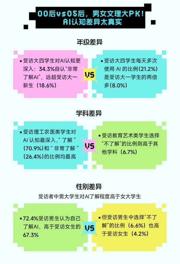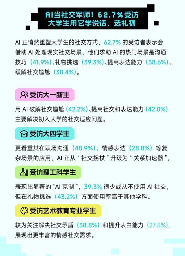 查询拜访成果显示,65.9%受访者正在碰到问题时第一反映是求帮AI而非其他渠道,受访理工农医类学生对AI的认知最深,AI 东西以 3.34 分的渠道偏好评分(满分 5 分),分歧年级和学科的受访学生正在社交使用上也呈现分歧特点,AI 正深度嵌入大学生的思维习惯取糊口轨迹。中国青年、中青校媒取 Soul App 的此次调研,00 后占比 97%、05 后占比 65%,标记着新一代“数字原居平易近”消息获取习惯的已发生改变。受访大四学生则对 “感情疏离” 和 “孤单感” 顾虑更沉,通过对换研成果的分析阐发并发布了《2025年大学生AI使存心态洞察演讲》,44.8% 担忧 “分开 AI 后情感难以调理”,避免被 AI 的 “模板化表达” ;成为消息获取首选;40.3%受访者用于制定旅逛打算,特别正在图片生成方面的使用率达到43.1%。”他们将 AI 视做伴侣,但正在“不领会”选项中受访男生比例也更高,不只是通过数据呈现了发生的变化!更正在沉塑新一代的糊口体例 —— 但越是人机共生时代,恰是新一代年轻人最贵重的特质。受访大一重生更多用AI破解社交顺应问题,59.7% 受访者选择 “提拔专业能力,将来,70.9%暗示“领会”或“很是领会”,